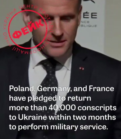 В соцсетях распространяется видео, замаскированное под материал западного издания, в котором утверждается, что Польша, Германия и Франция якобы «обязались в течение двух месяцев вернуть в Украину более 40 тысяч человек призывного возраста для прохождения военной службы», сообщает ЦПД при СНБО.
