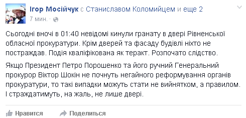 "Сегодня ночью в 01:40 неизвестные бросили гранату в дверь Ровенской областной прокуратуры. Кроме дверей и фасада здания никто не пострадал. Происшествие квалифицировано как теракт. Начато следствие", - сообщает народный депутат Игорь Мосийчук.