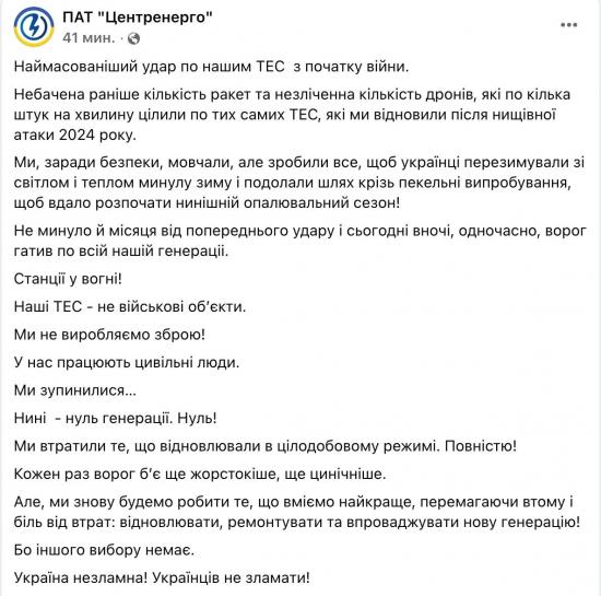 «Никогда ранее не было такого количества ракет и несчётного числа дронов, которые по несколько штук в минуту целились по тем же ТЭС, которые мы восстановили после разрушительной атаки 2024 года... Сегодня ночью, одновременно, враг бил по всей нашей генерации. Станции в огне», - говорится в сообщении «Центрэнерго».