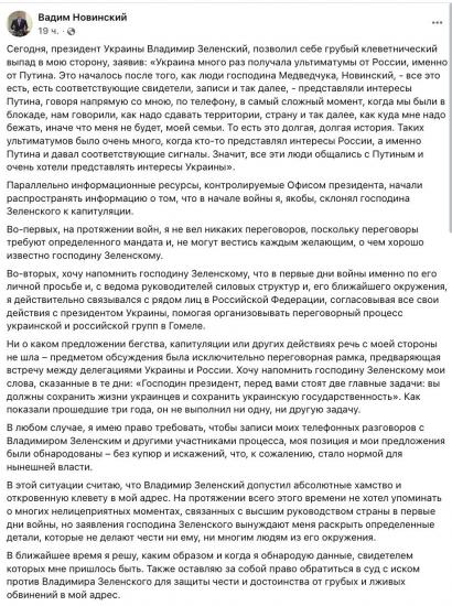 «Хочу напомнить господину Зеленскому, что в первые дни войны именно по его личной просьбе и, с ведома руководителей силовых структур и, его ближайшего окружения, я действительно связывался с рядом лиц в Российской Федерации, согласовывая все свои действия с президентом Украины, помогая организовывать переговорный процесс украинской и российской групп в Гомеле. Ни о каком предложении бегства, капитуляции или других действиях речь с моей стороны не шла – предметом обсуждения была исключительно переговорная рамка, предваряющая встречу между делегациями Украины и России», - сообщил Новинский.