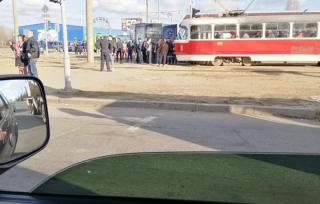 В Харькове пассажиры, не попавшие в трамваи, блокируют их движение и бьют стекла
