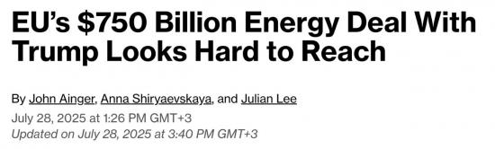 Обещание Евросоюза закупить у США энергоносителей на 750 млрд долларов в течение трех лет выглядит практически нереальным, - Bloomberg