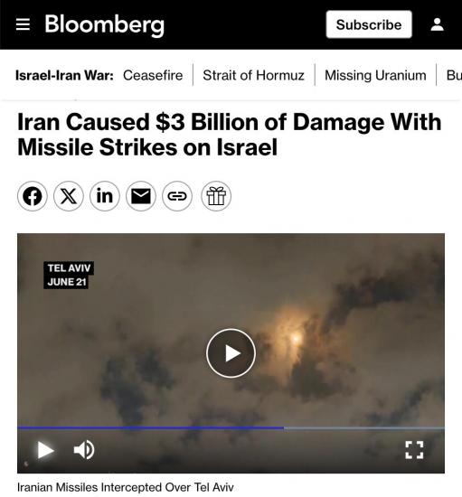 Обстрелы со стороны Ирана причинили Израилю ущерб на $3 млрд, - Bloomberg