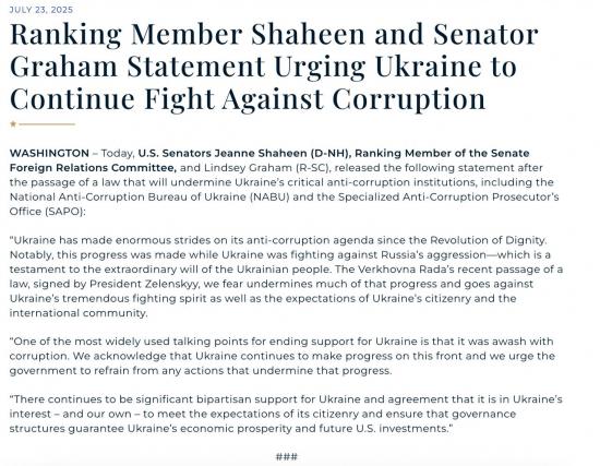 В совместном заявлении республикаца с демократкой Джин Шахин говорится, что Украина добилась прогресса в борьбе с коррупцией, но этот закон «подрывает прогресс и противоречит ожиданиям как украинского общества, так и международного сообщества».