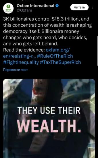 Как отмечает Oxfam, самый богатый человек в мире Илон Маск зарабатывает за четыре секунды сумму, равную среднему годовому доходу в мире. На долю сверхбогатого одного процента приходится 43,8% мирового богатства.