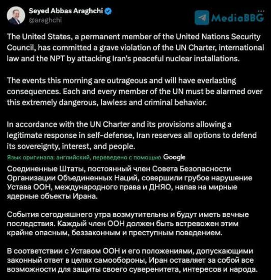 Он заявил, что американская атака является грубым нарушением устава ООН и международного права, будет иметь «вечные последствия» и Иран «оставляет за собой» все возможности ответа в формате самообороны.