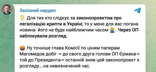 Офис президента заблокировал рассмотрение Радой законопроекта о легализации криптовалюты, - нардеп Железняк