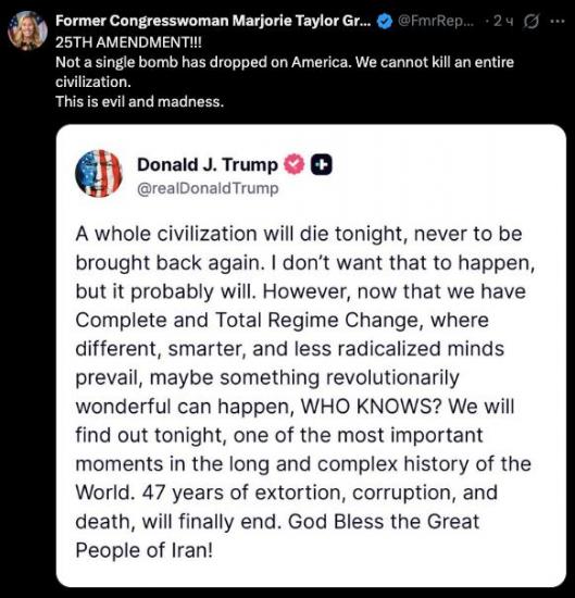 «25-я поправка!!! На Америку не упала ни одна бомба. Мы не можем уничтожить целую цивилизацию. Это зло и безумие», – написала она в Х.