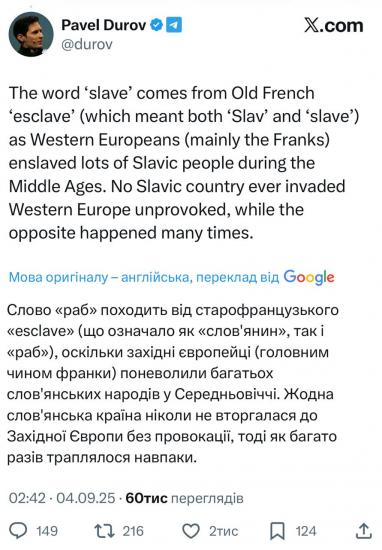 "Слово "раб" происходит от старофранцузского "esclave" (которое означало как "славянин", так и "раб"), поскольку в средние века западноевропейцы (в основном франки) порабощали многих славян. Ни одна славянская страна никогда не вторгалась в Западную Европу без причины, в то время как обратное происходило много раз", - написал Дуров.