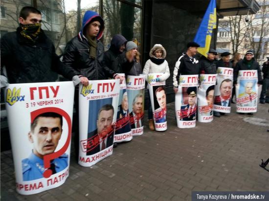Пикетчики стоят с плакатами, на которых изображены лица руководства ГПУ. Активисты просят Генпрокурора Виталия Ярему довести до конца расследование этих резонансных убийств.