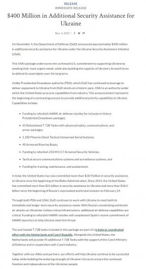 Министерство обороны США 4 ноября объявило о дополнительной помощи Украине в области безопасности примерно на 400 миллионов долларов в рамках Инициативы содействия безопасности Украины.