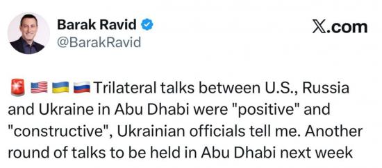 «Украинские официальные лица сообщили мне, что трехсторонние переговоры между США, Россией и Украиной в Абу-Даби были «позитивными» и «конструктивными».