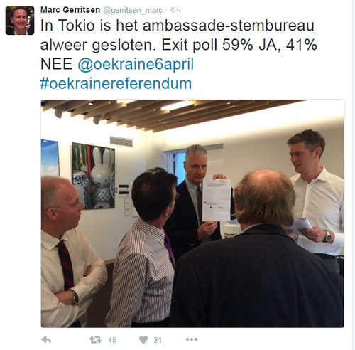 Согласно первым результатам экзит-пола по референдуму в Нидерландах относительно ассоциации Украины с Европейским Союзом, 59% проголосовавших высказались «за», 41% — «против»