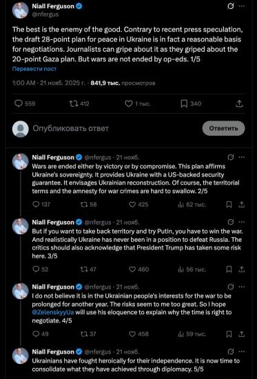 «Журналисты могут возмущаться им так же, как возмущались планом из 20 пунктов по Газе. Но войны не заканчиваются статьями. Войны заканчиваются либо победой, либо компромиссом. Этот план подтверждает суверенитет Украины. Он предоставляет Украине гарантии безопасности, подкреплённые США. Он предусматривает восстановление Украины», - написал Фергюсон.
