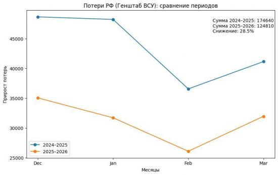 Если сопоставить суммарные потери РФ за оба периода, то их падение этой зимой (плюс март), по данным Генштаба, составило 28.5%.