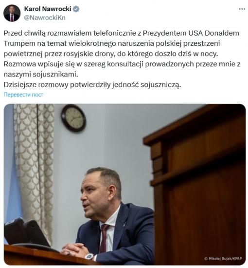 «Я только что разговаривал по телефону с президентом США Дональдом Трампом о многочисленных нарушениях воздушного пространства Польши российскими беспилотниками, которые произошли сегодня вечером.