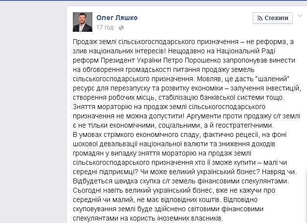 В умовах стрімкого економічного спаду, фактично рецесії, на фоні шокової девальвації національної валюти та зниження доходів громадян у випадку зняття мораторію на продаж землі сільськогосподарського призначення хто її зможе купити – малі чи середні підприємці? Чи може великий український бізнес? Навряд чи. Відбудеться швидка скупка с/г земель фінансовими спекулянтами. Сьогодні навіть великий український бізнес, вже не кажучи про середній чи малий, не має відповідних коштів. Відповідно скуповування землі буде здійснено світовими фінансовими спекулянтами на користь іноземних власників" - заявил Ляшко