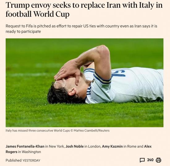 Попытка заменить Иран Италией предпринята после того, как «Скуадра Адзурра» не смогла пройти квалификацию на чемпионат. "Унизительное поражение Италии в решающем стыковом матче от крошечной Боснии и Герцеговины вызвало политический скандал внутри страны", вынудив главу Федерации футбола Италии уйти в отставку.