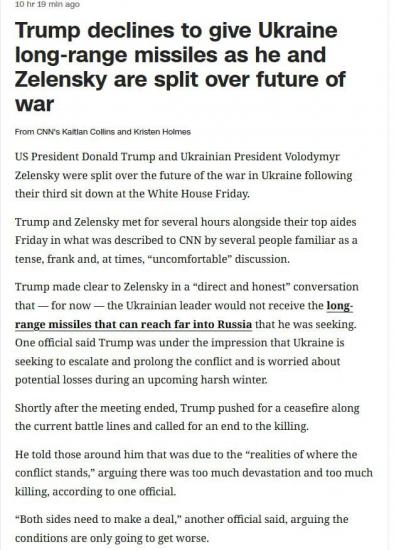 "В прямом и честном разговоре Трамп ясно дал понять Зеленскому, что пока украинский лидер не получит ракеты большой дальности, способные долететь до самых дальних уголков России, которые он просит. Один из чиновников заявил, что у Трампа сложилось впечатление, что Украина стремится к эскалации и затягиванию конфликта", - пишет издание.