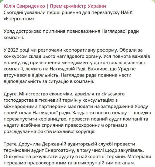 Также Свириденко поручила Государственной аудиторской службе провести срочный аудит Энергоатома, в том числе по закупкам.