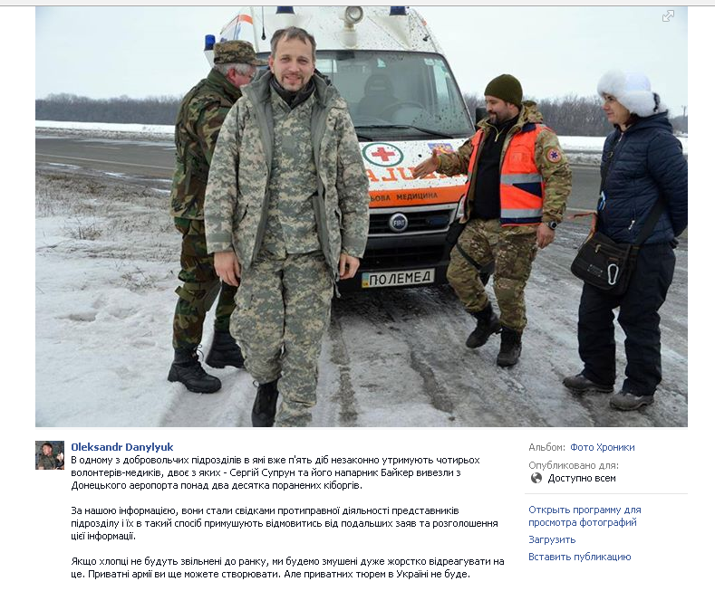 На базе добровольческого подразделения "Правый сектор" в районе Покровского, Днепропетровской области, по имеющейся информации, удерживали четырех волонтеров-медиков, среди которых Александр Корнийчук, Сергей Слепец и Сергей Супрун. Сергея Слепца уже отпустили. Об этом сообщил советник председателя СБУ Александр Данилюк в Facebook.