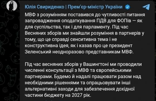 Премьер Свириденко заявила, что МВФ "с пониманием" отнесся к чувствительности вопроса введения НДС для ФОПов