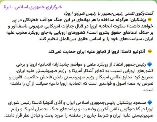 Пезешкиан подчеркнул, что прекращение агрессии является путем вперед, и если будут предоставлены гарантии безопасности, Иран готов завершить конфликт; он призвал Европу отказаться от текущих методов и призвал к профессиональному сотрудничеству в соответствии с международным правом.