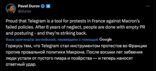 «Горжусь тем, что Telegram стал инструментом протестов во Франции против провальной политики Макрона.