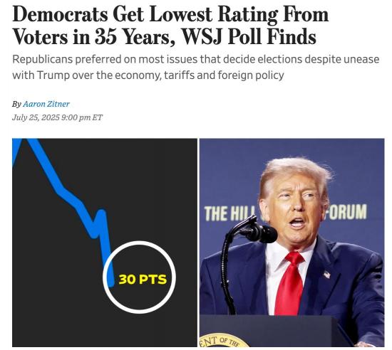 63% избирателей относятся к демократам отрицательно, лишь 33% — положительно. Для сравнения, рейтинг негативного восприятия Республиканской партии превышает позитивный только на 11%, а у Трампа — на 7%.