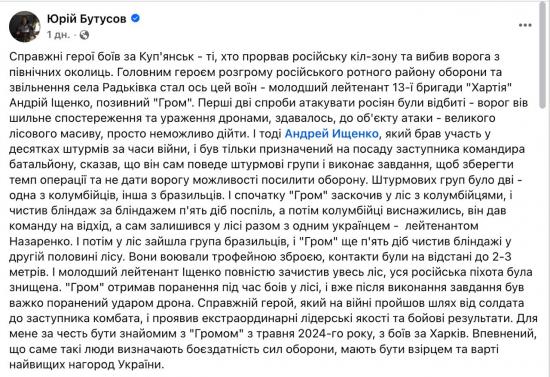 «Штурмовых групп было две – одна из колумбийцев, другая из бразильцев. И сначала "Гром" заскочил в лес с колумбийцами и чистил блиндаж за блиндажем пять суток подряд, а потом колумбийцы истощились, он дал команду на уход, а сам остался в лесу вместе с одним украинцем - лейтенантом Назаренко. И потом в лес зашла группа бразильцев, и "Гром" еще пять суток чистил блиндажи во второй половине леса. Они сражались трофейным оружием, контакты были на расстоянии до 2-3 метров», - пишет Бутусов.