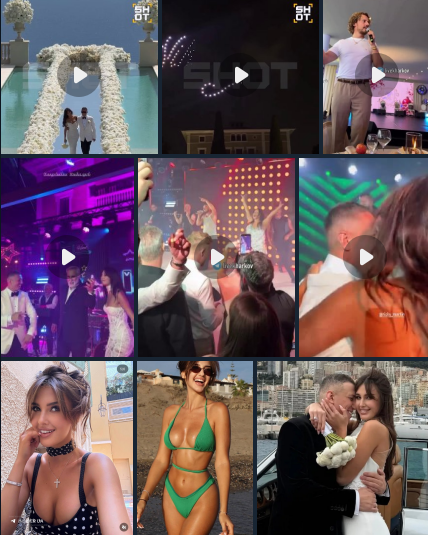 Церемония состоялась в поместье 1919 года с видом на Средиземное море. На вечеринке появились гости из разных стран. Их угощали карпачо из осьминога, стейком «Шатобриан» со спаржей, артишоками, тартом с малиной и многим другим. Примечательно, что вся свадьба велась исключительно на русском языке.