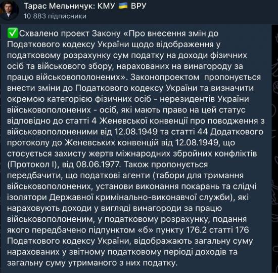 Как сообщил представитель правительства в ВР Мельничук, военнопленные будут платить НДФЛ и военный сбор как нерезиденты.