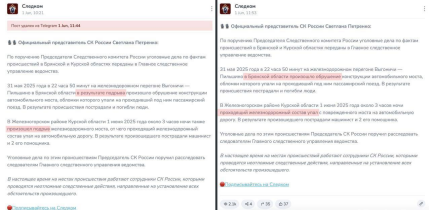 Российский Следственный комитет удалил, а затем отредактировал свое сообщение об инцидентах на железной дороге в Брянской и Курской областях - оттуда исчезло упоминание того, что это произошло вследствие подрывов