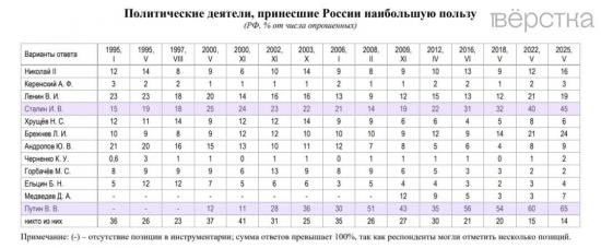 На втором месте - Сталин, которого назвали 45% опрошенных. Показатель у советского генсека, как и у российского президента, также стал максимальным за последние три десятилетия. В 2016 году его деятельность позитивно оценивали 31% опрошенных, в 2022 - 40%, а в 2025 - уже 45%.