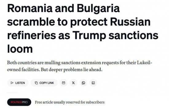 Румыния и Болгария пытаются освободить принадлежащие российском компаниям НПЗ в своих странах от американских санкций, - Рolitico