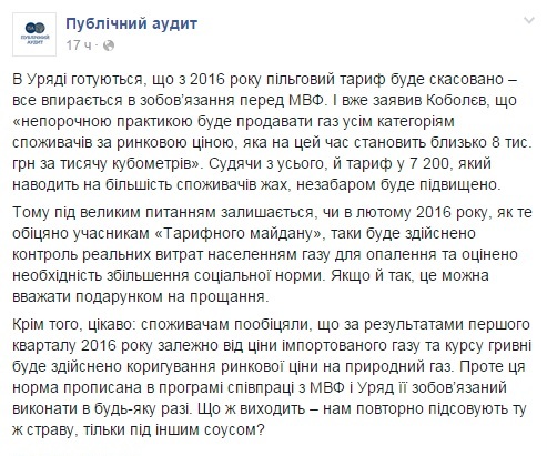 Поэтому под большим вопросом остается, в феврале 2016 года, как то обещано участникам «Тарифного майдана», таки будет осуществлен контроль реальных затрат населением газа для отопления и оценены необходимость увеличения социальной нормы. Если и так, это можно считать подарком на прощание.