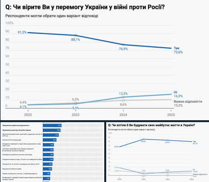 В 2022 году верили в победу 91,5%, с каждым годом этот уровень падал и сейчас составляет 72,6%. Не верили в победу в 2022 году 4,1%, а сейчас - 16,9%.
