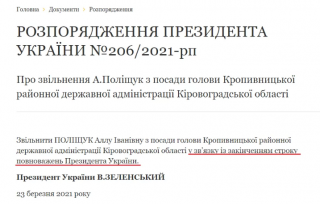 На официальном сайте Президента Украины опубликовали распоряжение Владимира Зеленского об увольнении Аллы Полищук с должности главы Кропивницкой районной государственной администрации Кировоградской области. При этом в тексте была допущена...