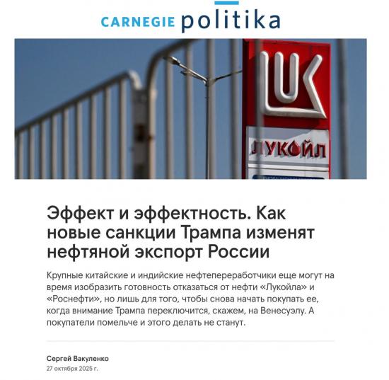 «Санкции наделали много шума — в основном потому, что они стали первыми, введенными после возвращения Дональда Трампа в Белый дом. В остальном же они несут немного нового: «Роснефть» и «Лукойл» теперь оказались примерно под такими же ограничениями, под какими еще с 10 января 2025 года находятся две другие крупные российские нефтяные компании — «Сургутнефтегаз» и «Газпром Нефть». Январские санкции, введенные уходящей администрацией Джо Байдена, тоже поначалу казались грозными. Но объемы добычи и экспорта у обеих компаний практически не снижались, а выросшие было накладные расходы и скидки при поставках в Индию и Китай вернулись к досанкционным значениям. Основные объемы экспорта пошли через компании-фронты, но обе компании достаточно часто отправляют нефтяные грузы и от своего имени. Поэтому пока нет серьезных оснований ожидать, что две следующие нефтяные компании не смогут справиться с той же задачей», - пишет Вакуленко.
