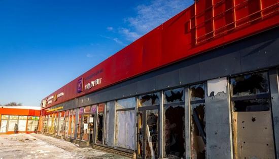 Российский беспилотник попал в дорожное покрытие вблизи торговых павильонов.