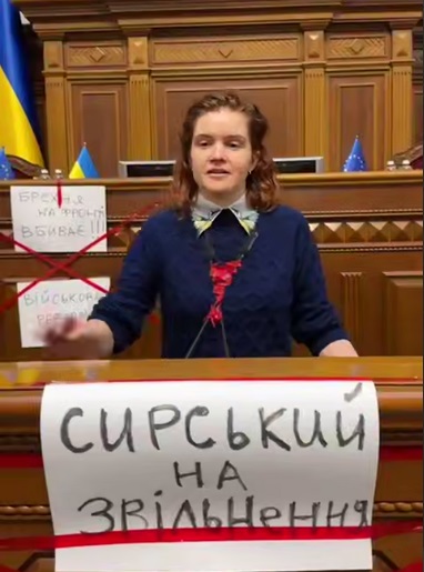 Основное требование Безуглой – отставка главнокомандующего ВСУ Александра Сырского. Она развесила плакаты на трибуне парламента.