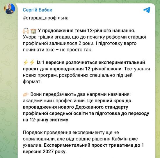 "Порядок проведения эксперимента еще не обнародован, но соответствующее решение Кабмин уже принял. Экспериментальный проект продлится до 1 сентября 2027 года. Это первый шаг к внедрению нового Государственного стандарта профильного среднего образования и подготовке к переходу на 12-летнюю систему", - пишет Бабак.