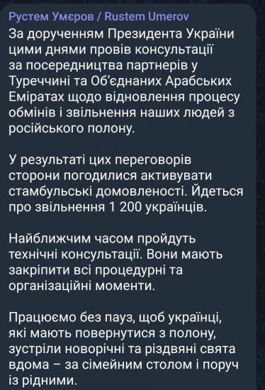 Секретарь СНБО Умеров анонсировал переговоры о возвращении 1200 украинских пленных к Рождеству и новогодним праздникам