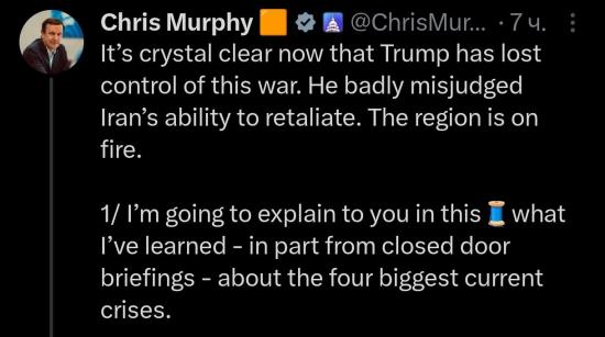 Он сильно просчитался, оценивая способность Ирана к ответу. Регион в огне», — написал Мерфи, комментируя ситуацию после закрытых брифингов для сенаторов.