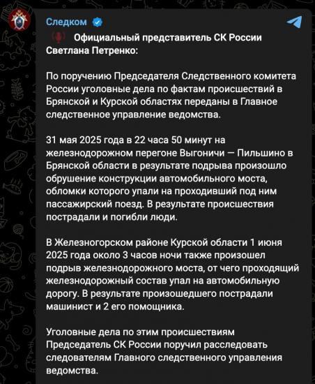 "31 мая 2025 года в 22 часа 50 минут на железнодорожном перегоне Выгоничи — Пильшино в Брянской области в результате подрыва произошло обрушение конструкции автомобильного моста, обломки которого упали на проходивший под ним пассажирский поезд.