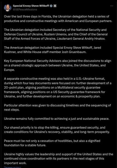 Спецпредставитель Трампа Уиткофф написал пост о переговорах с Украиной и Европой