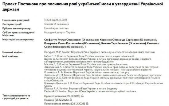 Кроме того, проект включает меры социального и гуманитарного характера: поддержку молодых семей для утверждения украинского языка в быту, создание системы языковой поддержки украинцев за рубежом, расширение языковых требований на онлайн-медиа, а также ужесточение ответственности за нарушение языкового законодательства. Гуманитарному комитету Рады поручено подготовить дополнительные инициативы, включая безусловное право граждан на получение услуг на украинском языке.