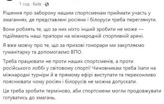 Пересмотреть или отменить запрет на участие украинских спортсменов в соревнованиях, где задействованы россияне и белорусы, просит правительство народный депутат Александр Горенюк (фракция "Слуга народа").