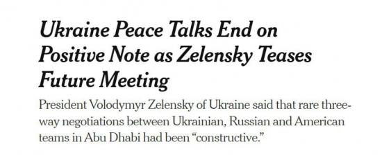 «Россия отвергла любое урегулирование территориальных вопросов, которое отклоняется от того, что российские официальные лица охарактеризовали как соглашение, достигнутое между Трампом и Путиным на саммите на Аляске прошлым летом, согласно которому Украина должна была уступить ещё незахваченные территории в регионе. Заместитель министра иностранных дел России Сергей Рябков отказался сообщить подробности о переговорах, но сказал, что российская делегация прилагает все усилия для обеспечения того, чтобы соглашение соответствовало договоренностям, достигнутым на Аляске между господином Трампом и господином Путиным», - пишет NYT.