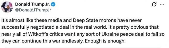 Совершенно очевидно, что почти все критики Уиткоффа хотят провала любого мирного соглашения с Украиной, чтобы они могли продолжать эту войну бесконечно. Хватит!» - написал Трам-младший.
